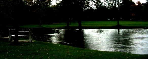 Nature sleeps in deep shadow in the park, near the shallow end of the pond.